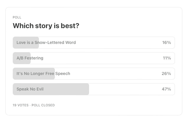 Speak No Evil was my entry to the second Midnight Vault—a Twilight Zone tribute project spearheaded by J. Curtis and Shane Bzdok (with so, so many great authors contributing). Barring that it gets chosen for publication (fingers crossed), it will remain free to read. I’ll be keeping It’s No Longer Free Speech, which is a fifteen-hundred-word dick joke at our president’s expense, free as well.